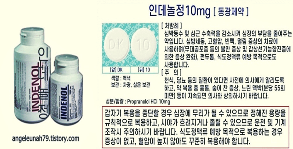 성분으로는 프로프라놀롤염산염 10mg의 성분이 안에 포함되어져 있으며,보관시에는 실온에서 햇빛이 들지않는 서늘한 곳이나 냉장보관을 하시면 되겠습니다.