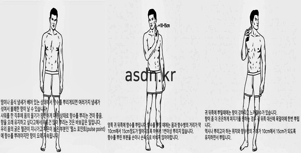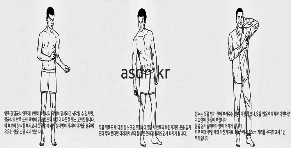 옷을 입은후에 만약 뿌려야한다면 겨드랑이 안쪽에 뿌려줍니다.이렇게하면 몸을 움직일때마다 향이 은은하게 퍼지게 되는데 역시 마찬가지로 10cm에서 15cm 거리를 두고서 1번 뿌려주면 됩니다.