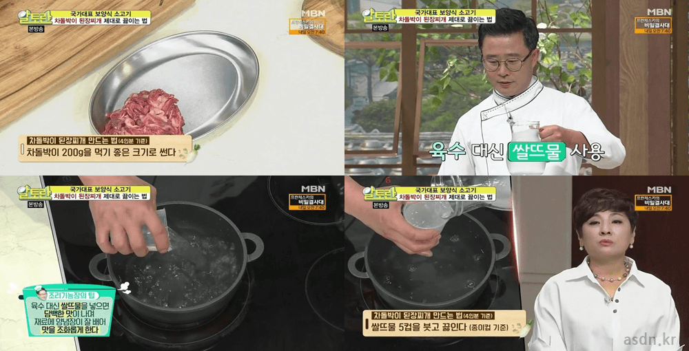 차돌박이 된장찌개 4인분 기준으로 쌀뜨물을 종이컵 기준으로 5컵을 붓고서 끓이는데 이때 사용되는 쌀뜨물은 첫번째 쌀뜨물이 아닌 2번에서 3번 걸러낸 쌀뜨물을 사용합니다.