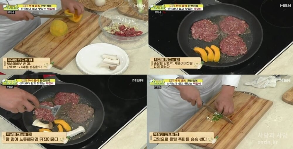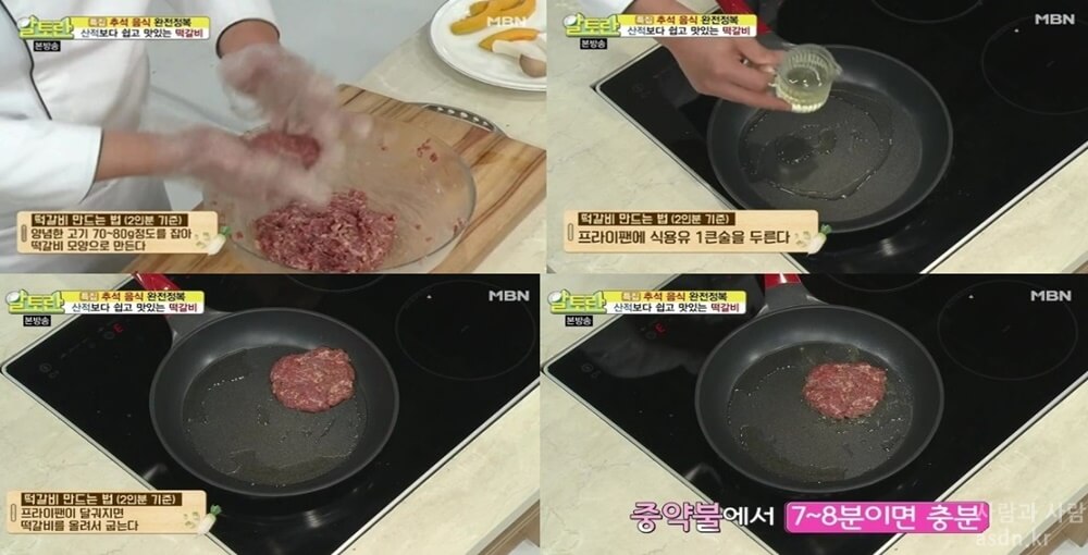 프라이팬이 달구어지게 되면 떡갈비를 올려서 굽게 되는데,이때에 중약불에서 은근하게 구워야지만 속까지 잘 익는다고 합니다.