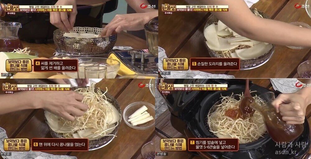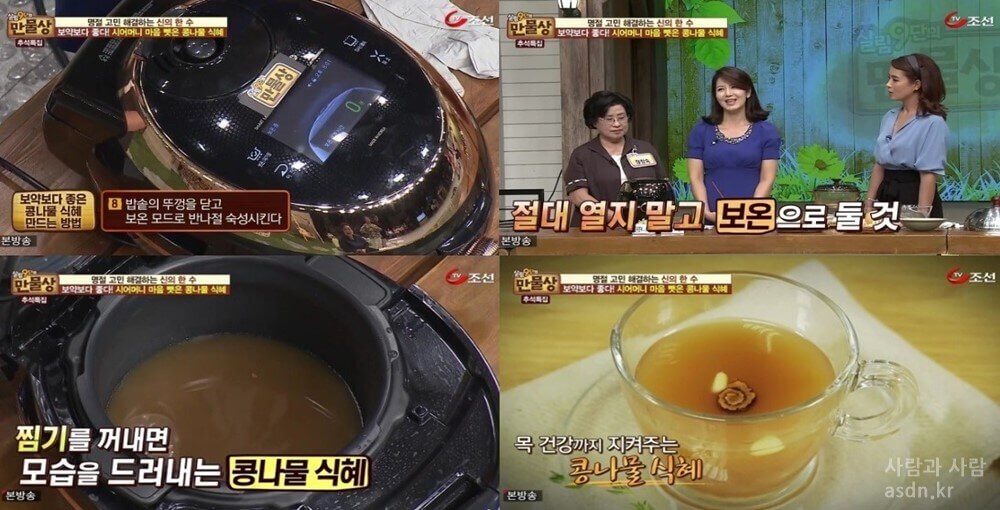 안녕하세요:) 사람과 사람 블로그입니다.이번 포스팅에서는 TV조선 만물상에서 방송한적이 있는 탤런트 최정원의수제 콩나물 식혜 만드는 비법을 알려 드리고자 합니다.
