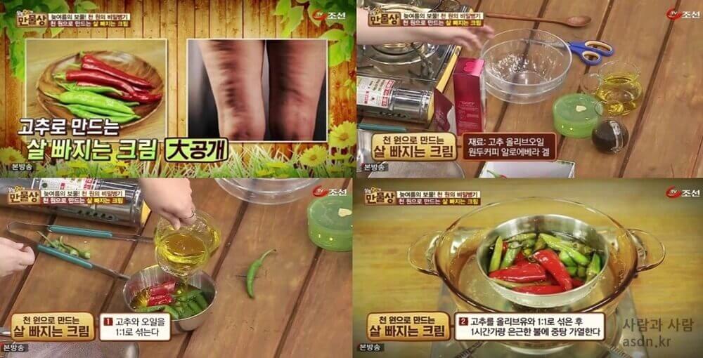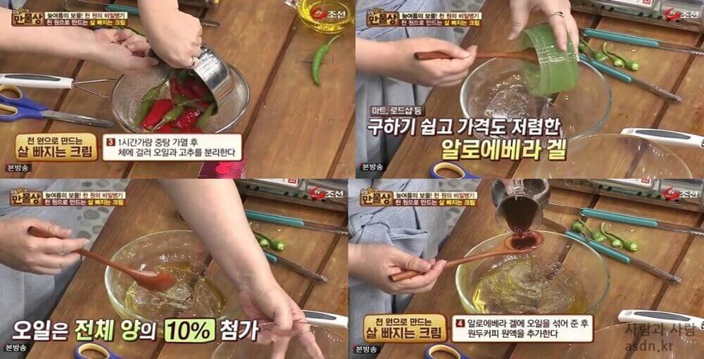 천원으로 만드는 살빠지는 크림의 재료로는 고추와 올리브오일과 원두커피와 알로에베라 겔이 필요합니다.