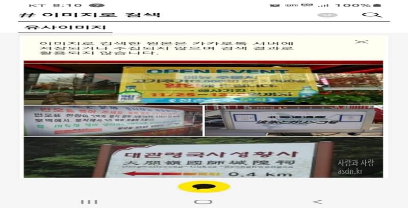 ●이렇게 이미지로 검색을 하게되면 유사이미지인 경우에는 이미지로 검색한 원본을 카카오톡 서버에 저장되거나 수집되지 않으며 검색 결화로 활용되지 않습니다.라는 메시지와 함께 사진과 같이 도용사진이라면 이와 유사한 이미지가 뜨게 될 것입니다.