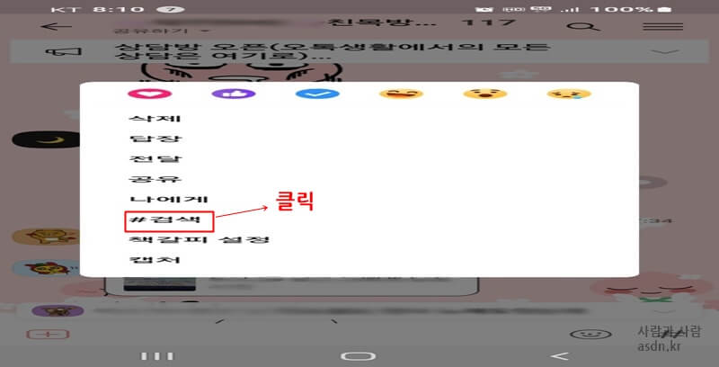 그러면 여러 메뉴인 삭제/답장/전달/공유/나에게/#검색/책갈피 설정/캡처가 나오는데 그 중에서 #검색을 클릭하시면 되겠습니다.