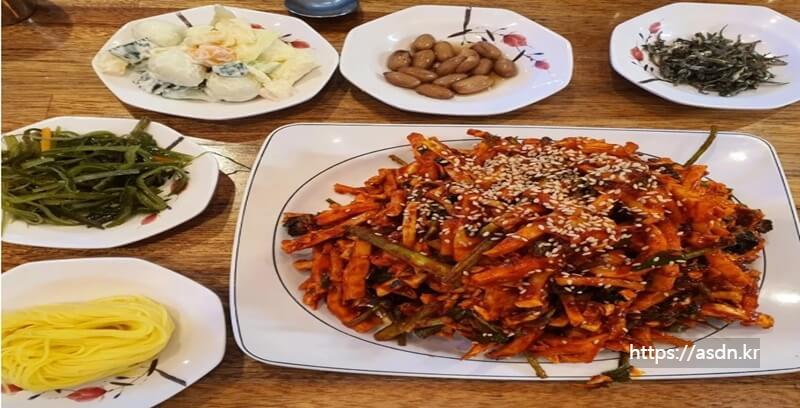 탱글한 오징어와 싱싱한 야채가 들어간 ‘오징어 무침회’와 동죽조개로 끓인 국인 ‘물뽕’이 맛있습니다.